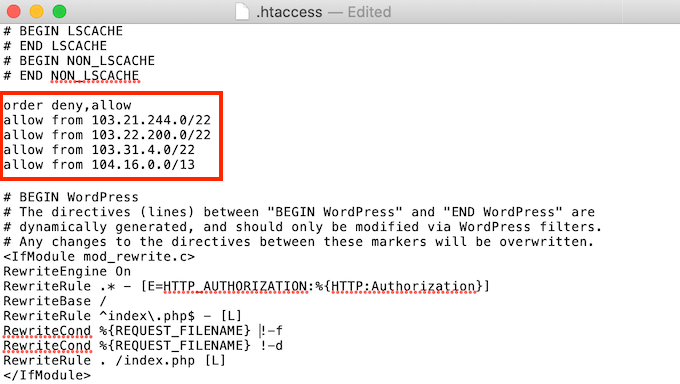 添加所有CloudFlare IP地址后,保存更改.您现在可以关闭.htaccess文件.